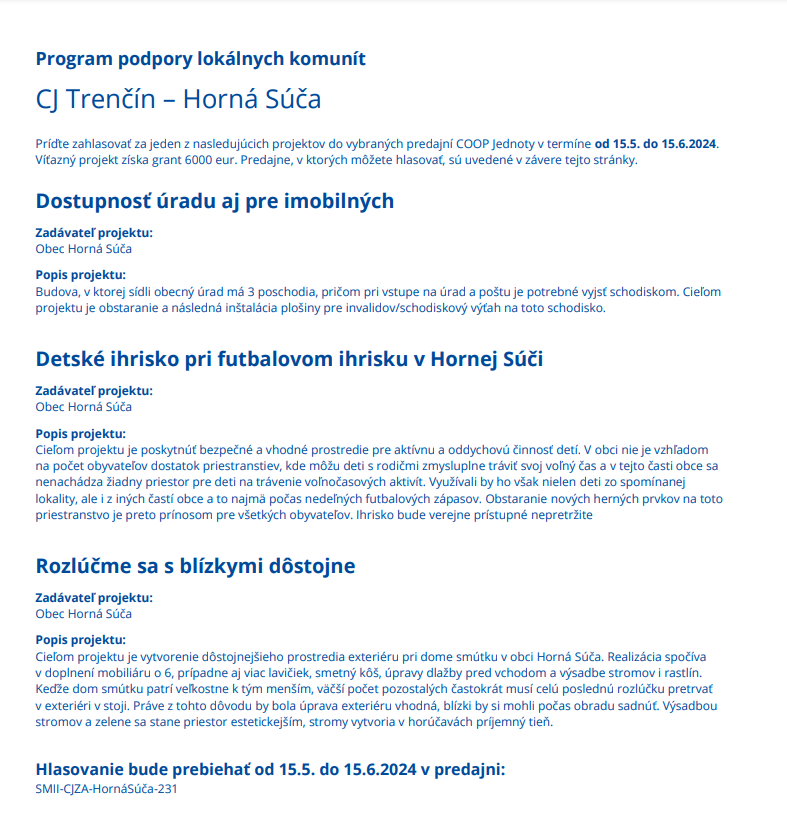 v predajni COOP Jednoty na námestí v obci. V predajni bude k dispozícii hlasovacia urna s popismi troch projektov. Zákazníci vhodením žetónov do urny zahlasujú za projekt, ktorý si vybrali a chcú ho podporiť. Žetóny dostanú zákazníci pri pokladniach za každý nákup podľa nasledujúceho mechanizmu: Za každých 5 € zo zrealizovaného nákupu dostane zákazník 1 žetón (nákup nie je potrebné rozdeľovať na menšie časti). Napríklad za nákup v celkovej hodnote 5,10 EUR dostane zákazník 1 žetón, za 12,50 € dostane 2 žetóny, za 29,90 € dostane 5 žetónov.